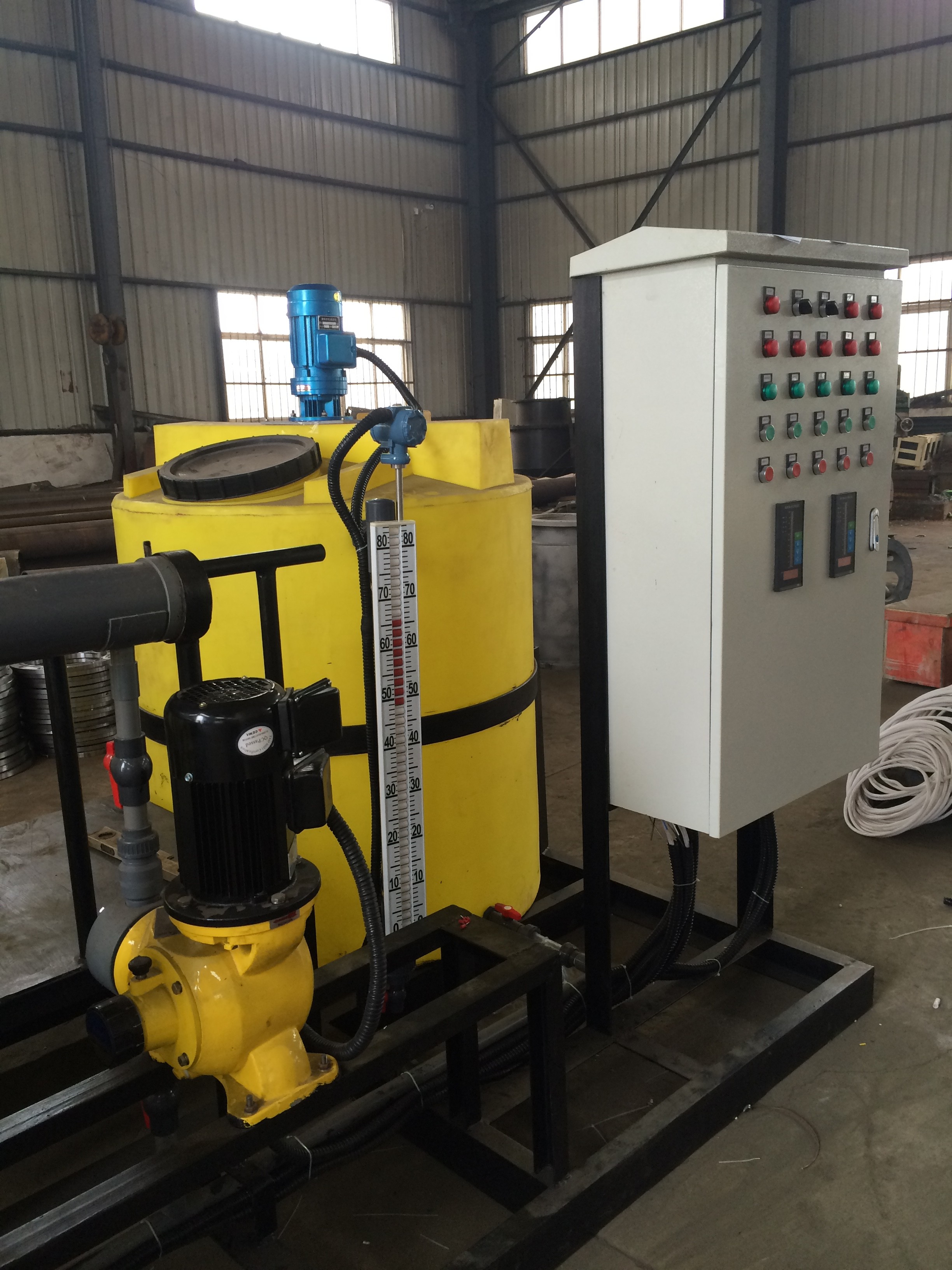 全自動一體化加藥裝置以計量泵為主要投加設(shè)備、將溶藥箱、攪拌器、液位計、安全閥、止回閥、壓力表、過濾器、緩沖器、管路、閥門、底座、扶梯、自動監(jiān)視系統(tǒng)、電力控制系統(tǒng)等按工藝流程需要組裝在一個公共平臺上,形成一個組合式單元。配有攪拌系統(tǒng)、加藥系統(tǒng)和自動控制系統(tǒng),幾個固定式可組合成一個整體。